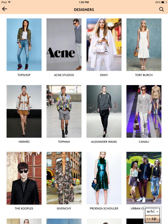 Whisp allows users to browse thousands of products from over 5,000 brands—ranging from fast fashion to high-end luxury items from Rag & Bone, Tom Ford, Urban Outfitters, Givenchy, Acne, Hermes, Topshop and more. Retailers onboard include Lane Crawford, Avenue 32, Farfetch, Gilt, Mytheresa, Nordstrom, Portero, Nasty Gal and Yoox.